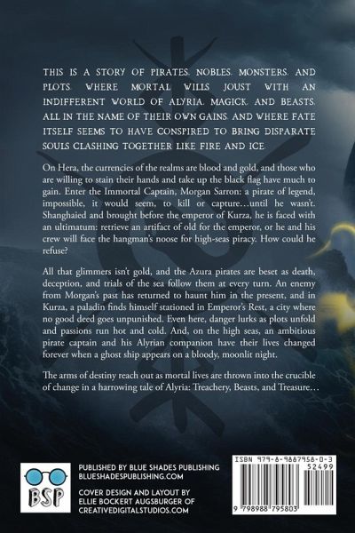 This is a story of pirates, nobles, monsters, and plots. Where mortal wills joust with an indifferent world of alyria, magick, and beasts, all in the name of their own gains. And where fate itself seems to have conspired to bring disparate souls clashing together like fire and ice. On Hera, the currencies of the realms are blood and gold, and those who are willing to stain their hands and take up the black flag have much to gain. Enter the Immortal Captain, Morgan Sarron: a pirate of legend, impossible, it would seem, to kill or capture...until he wasn't. Shanghaied and brought before the emperor of Kurza, he is faced with an ultimatum: retrieve an artifact of old for the emperor, or he and his crew will face the hangman's noose for high-seas piracy. How could he refuse? All that glimmers isn't gold, and the Azura pirates are beset as death, deception, and trials of the sea follow them at every turn. An enemy from Morgan's past has returned to haunt him in the present, and in Kurza, a paladin finds himself stationed in Emperor's Rest, a city where no good deed goes unpunished. Even here, danger lurks as plots unfold and passions run hot and cold. On the high seas, an ambitious pirate captain and his Alyrian companion have their lives changed forever when a ghost ship appears on a bloody, moonlit night. The arms of destiny reach out as mortal lives are thrown into the crucible of change in a harrowing tale of Alyria: Treachery, Beasts, and Treasure...