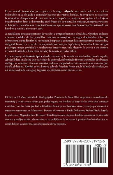 En un mundo fracturado por la guerra y la magia, Alyséth, una madre soltera de espíritu indomable, se ve obligada a comandar legiones en cruentas batallas. Su propósito es esclarecer la misteriosa desaparición de sus más leales compañeras, mujeres con quienes ha forjado inquebrantables lazos de hermandad en el fragor del combate. Sin embargo, mientras avanza en su búsqueda, descubre una conspiración oscura que amenaza con desmoronar los reinos de los hombres y sumir la tierra en el caos. A medida que atraviesa territorios devastados y antiguos bastiones olvidados, Alyséth se enfrenta a horrores salidos de las pesadillas: criaturas mitológicas, enemigos despiadados y fuerzas sobrenaturales que desafían su resistencia. Sus pasos la conducen hacia reencuentros inesperados, obligándola a revivir recuerdos de un pasado marcado por la pérdida y la traición. Entre intrigas palaciegas, magia prohibida y revelaciones impactantes, cada decisión la acerca a un destino irreversible, donde la línea entre la vida y la muerte se vuelve difusa. En esta epopeya de fantasía épica, donde la valentía y la astucia son tan letales como la espada, Alyséth lidera una lucha que trasciende lo personal, enfrentando fuerzas ancestrales que buscan doblegar su voluntad. Con una narrativa poderosa, cargada de acción, misterio y un romance que desafía el destino, Alyséth es una historia sobre la fortaleza femenina, la lealtad y el sacrificio, en un universo donde la magia y la guerra se entrelazan en un duelo eterno.