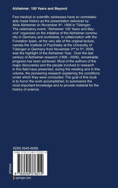 Alois Alzheimer.- Concerning a unique disease of the cerebral cortex.- The history of Alois Alzheimer's first case Auguste D..- Alois Alzheimer and the beginnings of research into Alzheimer's disease.- Alois Alzheimer and the myth of the pioneer.- The beginning of modern research.- Alzheimer's Disease at mid-Century (1927-1977) and a little more.- A chapter in the development on Alzheimer's disease research.- Anatomy & Neuropsychology.- Anatomical changes underlying dementia in Alzheimer's disease.- Staging of cortical neurofibrillary inclusions of the Alzheimer's type.- Of stains and brains: a brief account of how microscopic and clinical observations contributed to the understanding of Alzheimer's disease.- Presenile forms of Alzheimer's disease in 2006.- Cholinergic Deficit.- The cholinergic deficit in Alzheimer's disease.- Acetylcholine in AD: Expectations meet reality.- Amyloid and Genetics.- The Discovery of ? Amyloid.- Pathways to the discovery of the neuronal origin and proteolytic biogenesis of A? amyloid of Alzheimer's disease.- The Amyloid Hypothesis: history and alternatives.- Segregation of a missense mutation in the amyloid ?-protein precursor gene with familial Alzheimer's disease.- From the amyloid ? protein (A4) to isolation of the first Alzheimer's disease gene: amyloid ? (A4) precursor protein (APP).- Commentary on "Correlative memory deficits, A? elevation, and amyloid plaques in transgenic mice".- Vision for the future.- PS1, PS2, and APP mutations that cause Alzheimer's disease increase A?42.- Amyloid precursor protein, Alzheimer's disease, and Down's syndrome.- Catabolism of amyloid ? peptide and pathogenesis of sporadic Alzheimer's disease: towards understanding the underlying mechanisms.-Synaptic activity, amyloid-? and Alzheimer's disease.- Molecular pathogenesis of Alzheimer's disease in human peripheral cells: platelets show it all!.- The neuronal origin hypothesis of cerebral amyloid angiopathy.- A neuropathologist and Alzheimer genetics.- Genetics, molecular biology, and animal modeling of Alzheimer's disease.- The genetic Alzheimer-frontotemporal dementia spectrum.- Mutation of the Alzheimer's disease amyloid gene in hereditary cerebral hemorrhage, Dutch type. The role of amyloid in dementia and stroke.- Physiological generation of Amyloid ?-peptide and its Consequences for Alzheimer's disease research.- Activation of ?-secretase as an approach for treatment of Alzheimer's disease.- Challenges to the enigma of ?-secretase and to Alzheimer's disease.- Targeting ?-Secretase for Alzheimer's Disease.- The Presenilin/gamma-secretase complex and its potential as a drug target in Alzheimer's Disease.- Identification of ?-secretase.- ApoE.- Apolipoprotein E and Alzheimer's disease: A brief retrospective.- Apolipoprotein E4: From synaptic remodeling to genetic risk factor in both familial and sporadic Alzheimer's disease.- Tau.- The Alzheimer tangle - 100 years on..- Immunological demonstration of tau protein in neurofibrillary tangles.- Bulk isolation of neurofibrillary tangles and discoveries of tau and its abnormal hyperphosphorylation.- The natural and molecular history of Alzheimer's disease: Tau is part of the story.- Tau focused drug discovery for Alzheimer's disease and related Neurodegenerative Tauopathies.- Ubiquitin is a component of paired helical filaments in Alzheimer's disease.- Influence of tau on neuronal traffic mechanisms.- The Search for structure of tau and paired helical filaments.- OxidativeStress.- The Changing landscape of Alzheimer's disease: From Insoluble to Soluble and from Pathogen to Protector.- Molecular and cellular pathways towards and away from Alzheimer's disease.- Epidemiology.- Paquid: an integrated, multidisciplinary, population-based approach to normal and pathological cerebral aging.- Imaging.- Hippocampal imaging in the early diagnosis of AD, 1988 to 2006.- Detecting Early-Stage Alzheimer's Disease in MCI and PreMCI: The value of informants.- Imaging the pathology of Alzheimer's disease: Building on a century-Old blueprint.- Therapeutical Perspectives.- How do we test drugs?.- Inflammation and the lesions of Alzheimer's disease.- A? immunotherapy prevents and Reverses Alzheimer's disease neuropathology.- Immunotherapy of Alzheimer's disease.- "Magic" bullets, shotguns or cocktails to treat or prevent Alzheimer's disease?.- The seventh age of man: Solving senility.- Forum and Network.- Fondation Ipsen and Alzheimer's disease: a 20-year relationship.- Alzheimer Research Forum: A Knowledge Base and e-Community for AD Research.