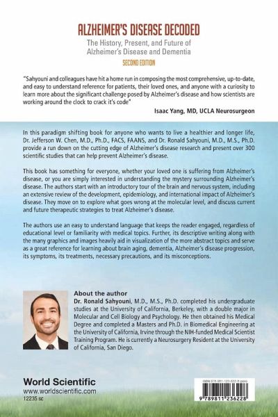This book aims to present, educate and inform individuals about Alzheimer's disease in a comprehensive manner. Its scope ranges from the discovery of the disease, epidemiology and basic biological principles underlying it, to advanced stem cell therapies used in the treatment of Alzheimer's. It adopts a "global" perspective on Alzheimer's disease, and include epidemiological data and science from countries around the world. Alzheimer's disease is a rapidly growing problem seen in every country around the world. This is the first and only comprehensive book to cover Alzheimer's disease, and includes the most updated literature and scientific progress in the field of dementia and Alzheimer's disease research. Most books on the market that focus on Alzheimer's disease are targeted at caregivers as practical advice on how to deal with loved ones with the disease. This book instead is a comprehensive and popular science book that can be read by anyone with an interest in learning more about the disease. Dr Jefferson Chen MD, PhD, co-author, participated in the world's first surgical clinical trial using shunts to treat Alzheimer's disease. His first-hand involvement in a clinical trial for patients with Alzheimer's disease and experience treating Normal Pressure Hydrocephalus (NPH) which is commonly misdiagnosed as Alzheimer's disease lends a unique perspective. This book with appeal to a wide audience, regardless of their scientific or educational background.