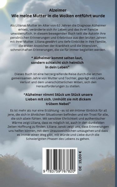 In diesem bewegenden Buch teilt die Autorin ihre persönlichen Erinnerungen und Erlebnisse aus den letzten Jahren mit ihrer Mutter. Liliana gewährt uns tiefe Einblicke in ihr Familienleben, die ersten Anzeichen der Krankheit und die intensiven, schmerzhaften Erinnerungen, die sie für immer begleiten werden.