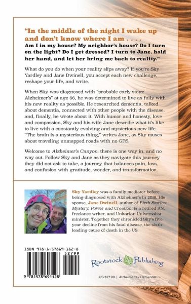 2023 IPNE Award Winner, Narrative Nonfiction 2022 Foreword INDIES Finalist, Health (Adult Nonfiction) 2023 Eric Hoffer Book Award Category Finalist 5-Star Readers' Favorite What do you do when your reality slips away? If you're Sky Yardley and Jane Dwinell, you accept each new challenge, reshape your life, and write. When Sky was diagnosed with "probable early stage Alzheimer's" at age 66, he was determined to live as fully with his new reality as possible. He researched dementia, talked about dementia, connected with other people with the disease, and, finally, he wrote about it. With humor and honesty, love and compassion, Sky and his wife Jane describe what it's like to live with a constantly evolving and mysterious new life. "The brain is a mysterious thing," writes Jane, as Sky muses about traveling unmapped roads with no GPS. Welcome to Alzheimer's Canyon: there is one way in, and no way out. Follow Sky and Jane as they navigate this journey they did not ask to take, a journey that balances pain, loss, and confusion with gratitude, wonder, and transformation.