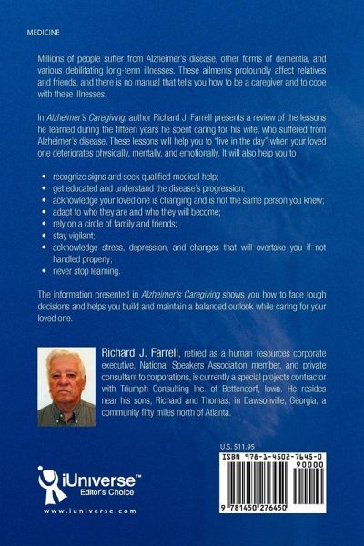 Millions of people suffer from Alzheimer's disease, other forms of dementia, and various debilitating long-term illnesses. These ailments profoundly affect relatives and friends, and there is no manual that tells you how to be a caregiver and to cope with these illnesses. In Alzheimer's Caregiving, author Richard J. Farrell presents a review of the lessons he learned during the fifteen years he spent caring for his wife, who suffered from Alzheimer's disease. These lessons will help you to "live in the day" when your loved one deteriorates physically, mentally, and emotionally. It will also help you to ¿ recognize signs and seek qualified medical help; ¿ get educated and understand the disease's progression; ¿ acknowledge your loved one is changing and is not the same person you knew; ¿ adapt to who they are and who they will become; ¿ rely on a circle of family and friends; ¿ stay vigilant; ¿ acknowledge stress, depression, and changes that will overtake you if not handled properly; ¿ never stop learning. The information presented in Alzheimer's Caregiving shows you how to face tough decisions and helps you build and maintain a balanced outlook while caring for your loved one.