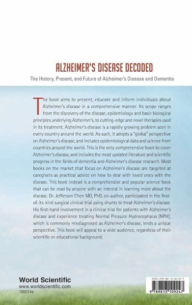 The book aims to present, educate and inform individuals about Alzheimer's disease in a comprehensive manner. Its scope ranges from the discovery of the disease, epidemiology and basic biological principles underlying it, to advanced stem cell therapies used in the treatment of Alzheimer's. It adopts a 'global' perspective on Alzheimer's disease, and include epidemiological data and science from countries around the world.Alzheimer's disease is a rapidly growing problem seen in every country around the world. This is the first and only comprehensive book to cover Alzheimer's disease, and includes the most updated literature and scientific progress in the field of dementia and Alzheimer's disease research.Most books on the market that focus on Alzheimer's disease are targeted at caregivers as practical advice on how to deal with loved ones with the disease. This book instead is a comprehensive and popular science book that can be read by anyone with an interest in learning more about the disease.Dr. Jefferson Chen MD, PhD, co-author, participated in the world's first surgical clinical trial using shunts to treat Alzheimer's disease. His first-hand involvement in a clinical trial for patients with Alzheimer's disease and experience treating Normal Pressure Hydrocephalus (NPH) which is commonly misdiagnosed as Alzheimer's disease lends a unique perspective.This book with appeal to a wide audience, regardless of their scientific or educational background.