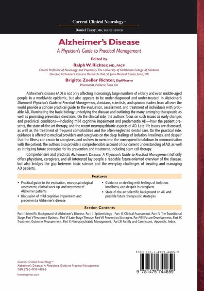 Alzheimer's disease (AD) is a devastating and dehumanizing illness affecting increasingly large numbers of elderly and even middle-aged persons in a worldwide epidemic. Alzheimer's Disease: A Physician's Guide to Practical Management was written by selected clinicians and scientists who represent some of the world's leading centers of excellence in AD research. The editors are proud and grateful for their profound contributions. This book is particularly designed to assist physicians and other health-care professionals in the evaluation, assessment, and treatment of individuals with AD. At the same time, by illuminating the basic scientific background, we hope to provide state-of-the art information about the disease and possible future therapeutic strategies. The recent psychiatric treatment aspects of AD are also clearly presented. Because the early diagnosis of the dementia process is now considered of increasing importance, we focus particularly in several chapters on early changes and preclinical conditions, such as mild cognitive impairment and predementia AD.