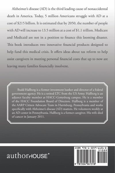 Alzheimer's disease (AD) is the third leading cause of nonaccidental death in America. Today, 5 million Americans struggle with AD at a cost of $215 billion. It is estimated that by 2050, the number of people with AD will increase to 13.5 million at a cost of $1.1 trillion. Medicare and Medicaid are not in a position to finance this looming disaster. This book introduces two innovative financial products designed to help fund this medical crisis. It offers ideas about tax reform to help assist caregivers in meeting personal financial costs that up to now are leaving many families financially insolvent.