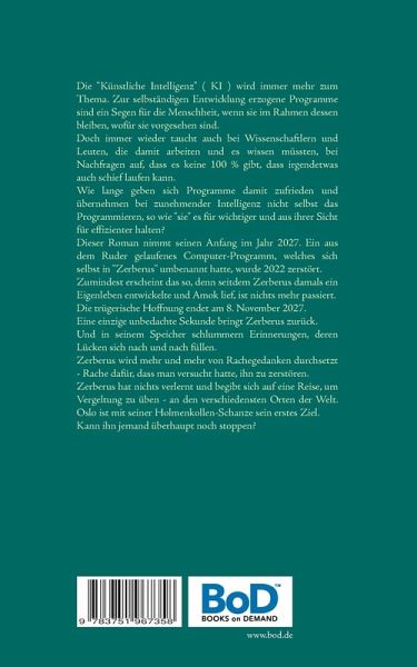 Die "Künstliche Intelligenz" ( KI ) wird immer mehr zum Thema. Zur selbständigen Entwicklung erzogene Programme sind ein Segen für die Menschheit, wenn sie im Rahmen dessen bleiben, wofür sie vorgesehen sind. Doch immer wieder taucht auch bei Wissenschaftlern und Leuten, die damit arbeiten und es wissen müssten, bei Nachfragen auf, dass es keine 100 % gibt, dass irgendetwas auch schief laufen kann. Wie lange geben sich Programme damit zufrieden und übernehmen bei zunehmender Intelligenz nicht selbst das Programmieren, so wie "sie" es für wichtiger und aus ihrer Sicht für effizienter halten?Dieser Roman nimmt seinen Anfang im Jahr 2027. Ein aus dem Ruder gelaufenes Computer-Programm, welches sich selbst in "Zerberus" umbenannt hatte, wurde 2022 zerstört.Zumindest erscheint das so, denn seitdem Zerberus damals ein Eigenleben entwickelte und Amok lief, ist nichts mehr passiert.Die trügerische Hoffnung endet am 8. November 2027. Eine einzige unbedachte Sekunde bringt Zerberus zurück.Und in seinem Speicher schlummern Erinnerungen, deren Lücken sich nach und nach füllen.Zerberus wird mehr und mehr von Rachegedanken durchsetzt - Rache dafür, dass man versucht hatte, ihn zu zerstören.Zerberus hat nichts verlernt und begibt sich auf eine Reise, um Vergeltung zu üben - an den verschiedensten Orten der Welt. Oslo ist mit seiner Holmenkollen-Schanze sein erstes Ziel.Kann ihn jemand überhaupt noch stoppen?