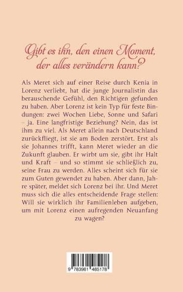 Gibt es ihn, den einen Moment, der alles verändern kann? Als Meret sich auf einer Reise durch Kenia in Lorenz verliebt, hat die junge Journalistin das berauschende Gefühl, den Richtigen gefunden zu haben. Aber Lorenz ist kein Typ für feste Bindungen: zwei Wochen Liebe, Sonne und Safari - ja. Eine langfristige Beziehung? Nein, das ist ihm zu viel. Als Meret allein nach Deutschland zurückfliegt, ist sie am Boden zerstört. Erst als sie Johannes trifft, kann Meret wieder an die Zukunft glauben. Er wirbt um sie, gibt ihr Halt und Kraft - und so stimmt sie schließlich zu, seine Frau zu werden. Alles scheint sich für sie zum Guten gewendet zu haben. Aber dann, Jahre später, meldet sich Lorenz bei ihr. Und Meret muss sich die alles entscheidende Frage stellen: Will sie wirklich ihr Familienleben aufgeben, um mit Lorenz einen aufregenden Neuanfang zu wagen?