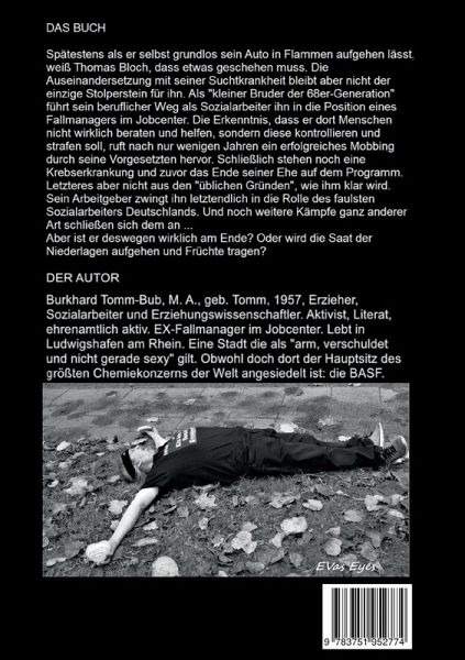 DAS BUCH Spätestens als er selbst grundlos sein Auto in Flammen aufgehen lässt, weiß Thomas Bloch, dass etwas geschehen muss. Die Auseinandersetzung mit seiner Suchtkrankheit bleibt aber nicht der einzige Stolperstein für ihn. Als "kleiner Bruder der 68er-Generation" führt sein beruflicher Weg als Sozialarbeiter ihn in die Position eines Fallmanagers im Jobcenter. Die Erkenntnis, dass er dort Menschen nicht wirklich beraten und helfen, sondern diese kontrollieren und strafen soll, ruft nach nur wenigen Jahren ein erfolgreiches Mobbing durch seine Vorgesetzten hervor. Schließlich stehen noch eine Krebserkrankung und zuvor das Ende seiner Ehe auf dem Programm. Letzteres aber nicht aus den "üblichen Gründen", wie ihm klar wird. Sein Arbeitgeber zwingt ihn letztendlich in die Rolle des faulsten Sozialarbeiters Deutschlands. Und noch weitere Kämpfe ganz anderer Art schließen sich dem an. Aber ist er deswegen wirklich am Ende? Oder wird die Saat der Niederlagen aufgehen und Früchte tragen?
