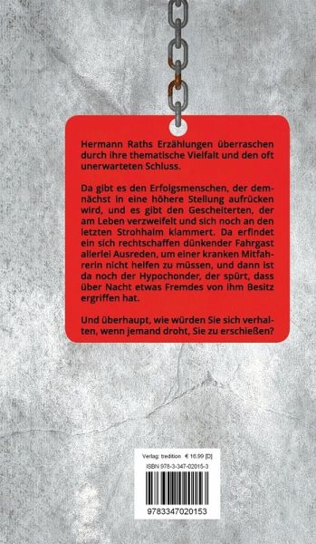 Hermann Raths Erzählungen überraschen durch ihre thematische Vielfalt und den oft unerwarteten Schluss. Da gibt es den Erfolgsmenschen, der demnächst in eine höhere Stellung aufrücken wird, und es gibt den Gescheiterten, der am Leben verzweifelt und sich noch an den letzten Strohhalm klammert. Da erfindet ein sich rechtschaffen dünkender Fahrgast allerlei Ausreden, um einer kranken Mitfahrerin nicht helfen zu müssen, und dann ist da noch der Hypochonder, der spürt, dass über Nacht etwas Fremdes von ihm Besitz ergriffen hat. Und überhaupt, wie würden Sie sich verhalten, wenn jemand droht, Sie zu erschießen?