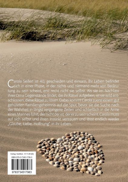 Carola Seifert ist 40, geschieden und einsam. Ihr Leben befindet sich in einer Phase, in der nichts und niemand mehr von Bedeutung zu sein scheint, erst recht nicht sie selbst. Als sie im Nachlass ihrer Oma Gegenstände findet, die ihr Rätsel aufgeben, ist sie wild entschlossen, diese Rätsel zu lösen. Dabei kommt Carola zuerst einem gut gehüteten Familiengeheimnis auf die Spur, bevor sie die Suche nach der Wahrheit in längst vergangene Zeiten und schließlich in die Arme eines Mannes führt, der nicht der ist, der er zu sein scheint. Carola muss auf sich selbst und ihren Instinkt vertrauen und lässt endlich wieder "Glaube, Liebe, Hoffnung" in ihr Leben.