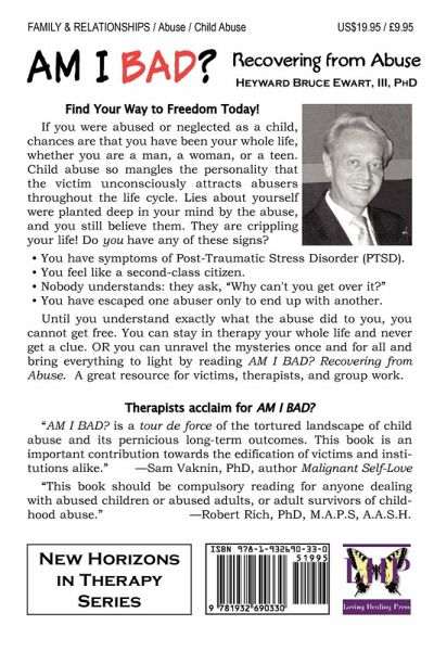 Find Your Way to Freedom Today! If you were abused or neglected as a child, chances are that you have been your whole life, whether you are a man, a woman, or a teen. Child abuse so mangles the personality that the victim unconsciously attracts abusers throughout the life cycle. Lies about yourself were planted deep in your mind by the abuse, and you still believe them. They are crippling your life! Do you have any of these signs? You have symptoms of Post-Traumatic Stress Disorder (PTSD). You feel like a second-class citizen. Nobody understands: they ask, "Why can't you get over it?" You have escaped one abuser only to end up with another. Until you understand exactly what the abuse did to you, you cannot get free. You can stay in therapy your whole life and never get a clue. OR you can unravel the mysteries once and for all and bring everything to light by reading AM I BAD? Recovering from Abuse. A great resource for victims, therapists, and group work. Therapists acclaim for AM I BAD? "AM I BAD? is a tour de force of the tortured landscape of child abuse and its pernicious long-term outcomes. This book is an important contribution towards the edification of victims and institutions alike." -Sam Vaknin, PhD, author Malignant Self-Love "This book should be compulsory reading for anyone dealing with abused children or abused adults, or adult survivors of childhood abuse." -Robert Rich, PhD, M.A.P.S, A.A.S.H. The New Horizons in Therapy Series from Loving Healing Press (www.LovingHealing.com)