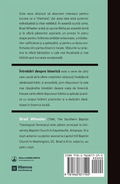 4 Steps for Testing the "Call" to Ministry Many new believers have questions about what it means to live as a Christian in the context of a local church, and pastors are looking for resources to pass along to their congregations to help them think biblically about the Christian life. Created in partnership with 9Marks, Church Questions is a series that seeks to provide ordinary Christians with sound and accessible biblical teaching by answering common questions Christians have about church life. Each booklet offers biblical answers and practical applications with the goal of nurturing healthy church practice and commitment. In this addition to the series, pastor Brad Wheeler addresses the shortcomings of the word "calling" when talking with aspiring pastors about their desire to pursue ministry. Explaining why the idea of calling is both unbiblical and even unhelpful, Wheeler suggests a 4-part process as a better alternative¿cultivate godly ambition, display godly attributes, develop an aptitude for teaching and discipleship, and receive the affirmation of a local church. Written from personal experience, this short book is designed to encourage men trying to discern their "next steps" to pastoral ministry.