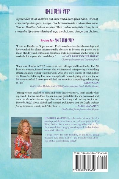 Endless lines of coke, and enough alcohol to kill most people. A fractured skull, two rapes, five broken hearts, and cancer. Most people would never make it out alive ... then there's Heather Gaines. Heather survived it all-and so much more-in this triumphant story of a life once stolen by drugs, booze, and some very dangerous choices. Am I Dead Yet? chronicles the life of Heather Gaines, a carefree California teen who is torn away from her beloved alcoholic father, only to become one herself. From her adventurous globetrotting career as a yacht chef through her years in the restaurant business, her substance abuse escalated to frightening levels, teetering her on the edge of death too many times to count. But she always believed there was HOPE. Again and again, Heather's earthy sense of humor and remarkably resilient character pull her through innumerable situations fraught with danger and uncertainty, from the US to the Caribbean to the Mediterranean. Few people could have survived what she did, yet today she is a healthy, beautiful, grateful woman who views every new day as a precious gift. A compelling, inspirational must-read for anyone (or the loved one of anyone) struggling with a drug or alcohol problem.