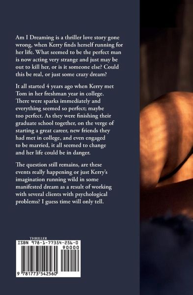 Am I Dreaming is a thriller love story gone wrong, when Kerry finds herself running for her life. What seemed to be the perfect man is now acting very strange and just may be out to kill her, or is it someone else? Could this be real, or just some crazy dream? It all started 4 years ago when Kerry met Tom in her freshman year in college. There were sparks immediately and everything seemed so perfect; maybe too perfect. As they were finishing their graduate school together, on the verge of starting a great career, new friends they had met in college, and even engaged to be married, it all seemed to change and her life could be in danger. The question still remains, are these events really happening or just Kerry's imagination running wild in some manifested dream as a result of working with several clients with psychological problems? I guess time will only tell.