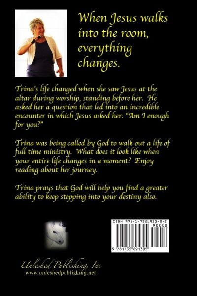 When Jesus walks into the room, everything changes. Trina's life changed when she saw Jesus at the altar during worship, standing before her. He asked her a question that led into an incredible encounter in which Jesus asked her: "Am I enough for you?" Trina was being called by God to walk out a life of full time ministry. What does it look like when your entire life changes in a moment? Enjoy reading about her journey. Trina prays that God will help you find a greater ability to keep stepping into your destiny also.