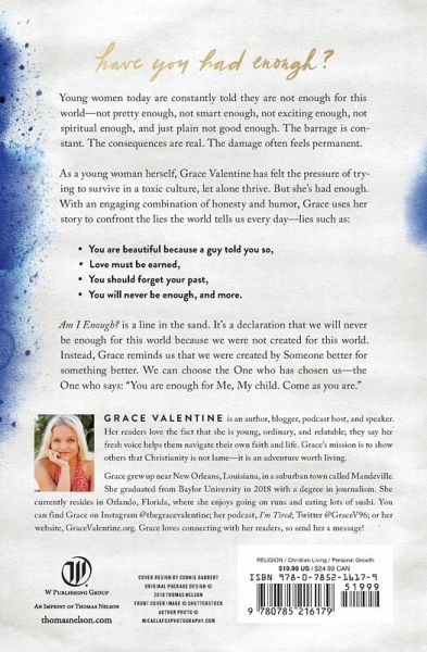 Have you had enough of not feeling enough? Grace Valentine identifies the lies that many young women believe about their identity and self-worth, sharing her own struggles with these lies and how she overcame them through her faith in Jesus. Young women today are constantly told they are not enough for this world--not pretty enough, not smart enough, not exciting enough, and just plain not good enough. Grace Valentine has felt the pressure of trying to survive in a toxic culture, let alone thrive. But she's had enough. Grace uses her story to confront the lies the world tells us every day--lies such as: * You are beautiful--but only because a guy told you so * Love must be earned and isn't freely given * You should forget your past * You will never be enough Am I Enough? is a line in the sand. It's a declaration that we will never be enough for this world, because we were created by Someone better for something better. Grace's fresh voice will help you leave your insecurities behind and realize your unique identity in Christ. Discover how to push past the lies and find confidence in who you were made to be!