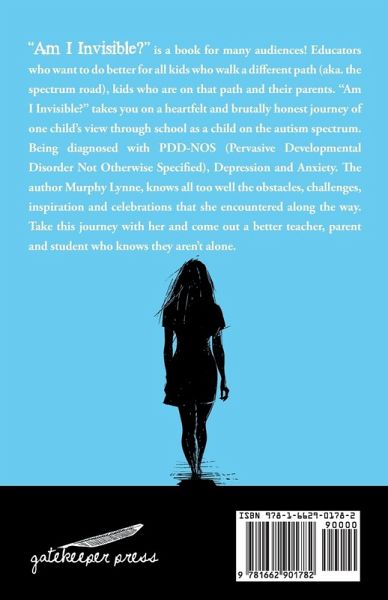 "Am I Invisible?" is a book for many audiences! Educators who want to do better for all kids who walk a different path (aka. the spectrum road), kids who are on that path and their parents. "Am I Invisible?" takes you on a heartfelt and brutally honest journey of one child's view through school as a child on the autism spectrum. Being diagnosed with PDD-NOS (Pervasive Developmental Disorder Not Otherwise Specified), Depression and Anxiety. The author Murphy Lynne, knows all too well the obstacles, challenges, inspiration and celebrations that she encountered along the way. Take this journey with her and come out a better teacher, parent and student who knows they aren't alone.