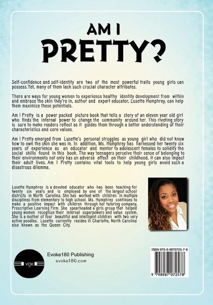 Self-confidence and self-identity are two of the most powerful traits young girls can possess. Yet, many of them lack such crucial character attributes. There are ways for young women to experience healthy identity development from within and embrace the skin they're in, author and expert educator, Lusette Humphrey, can help them maximize these potentials. Am I Pretty is a power packed picture book that tells a story of an eleven year old girl who finds the internal power to change the community around her. This riveting story is sure to make readers reflect as it guides them through a better understanding of their characteristics and core values. Am I Pretty emerged from Lusette's personal struggles as a young girl who did not know how to own the skin she was in. In addition, Ms. Humphrey has harnessed her twenty-six years of experience as an educator and mentor to adolescent females to solidify the social skills found in this book. The way teenagers perceive their sense of belonging to their environments not only has an adverse effect on their childhood, it can also impact their adult lives. Am I Pretty contains vital tools to help young girls avoid such a disastrous dilemma.