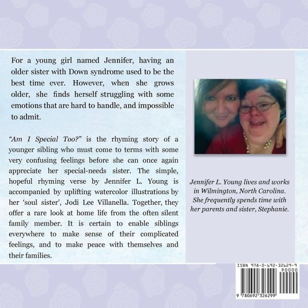 This true story begins with a young girl growing up with her older sister, Stephanie, who was born with Down Syndrome. When Jennifer was young she didn't notice much difference between herself and Stephanie but as she grew older she started to develop feelings that she didn't know how to handle. The story follows Jennifer's emotional and spiritual journey. The beautiful watercolor illustrations by her 'soul sister', Jodi Lee Villanella, help to bring life to the words. Together, they are able to create a gateway into the life of the often silent sibling in this seemingly rare situation. It's the author's hope that the family or sibling of someone with any kind of special need, will be able to come to terms with their feelings. It may not be today, tomorrow or even a year from now but eventually they will be at peace, just as Jennifer is with her family and her sister.