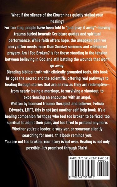 Are you secretly struggling beneath the surface, thriving outwardly but feeling deeply wounded within? In "Am I Too Broken?", trauma therapist, and Christian, Felicia Edwards, LMFT compassionately guides readers on an empowering journey to reclaim emotional freedom and healing from buried trauma from the past. Felicia provides vulnerable stories of her experience to break the wall of perfectionism. Blending evidence-based practices such as EMDR, attachment theory, and trauma-sensitive strategies with faith-driven reflective scriptures, this powerful workbook offers practical, interactive exercises to help you understand your trauma symptoms, navigate emotional boundaries, and cultivate healthy relationships. You'll explore core concepts like nervous system dysregulation, traumatic attachment patterns, neuroplasticity, and the therapeutic benefits of intentional breath prayers rooted in Scripture, facilitating genuine self-understanding. Through meaningful psychoeducation tools, actionable self-care strategies, and guided meditations, you'll learn to assertively communicate your needs, establish emotional and relational boundaries without guilt, and transform trauma-driven anxiety into lasting resilience. Felicia's approach combines therapeutic insights, spiritual wisdom, and practical breath prayer techniques, helping you overcome feelings of shame, silence, and spiritual disconnection. "Am I Too Broken?" reassures you that no matter the depth of your hidden pain, recovery and restoration are entirely possible. Discover how purpose-filled breathing can calm your body, reconnect you authentically, and deepen your faith. Start your journey toward reclaiming your voice, reconnecting authentically, and finding peace today. Bonus: Scan-able interactive follow along audio and video included to enhance the reader experiences