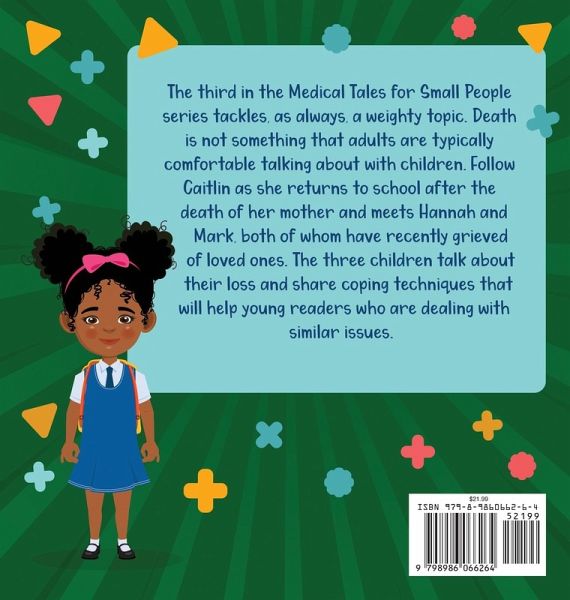 Caitlin's mom, Hannah's big sister, Justine and Mark's dad; All three children have experienced the death of their loved ones, and don't quite know how to deal with it until Ms. Paulo, a bereavement counselor steps up and teaches them that loss is always hard. Medical Tales for Small People, the hard-hitting and pragmatic series that introduces children to difficult topics: From creating a memorial to journaling to imagining their lost loved one as an angel looking down on them. This practical discussion of how it feels when someone dies is an ideal introduction to the tricky subject of death and grieving to very young children. Look out for the other books in this gentle but unsentimental series that sits well on any bookshelf: at home, at school or in the library - ready and waiting, should it be needed.