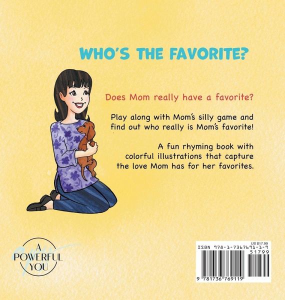 Join mom on her journey to answer the question "Am I Your Favorite?". She plays a silly game as she shares all her favorite things about her children. Read along with fun rhymes and beautiful illustrations. Perfect for children ages 3-7. Rhyming stories help kids learn to read and understand language earlier. Grab a copy for all YOUR favorites and visit the author's website for bonus content.