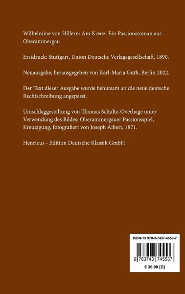 Wilhelmine von Hillern: Am Kreuz. Ein Passionsroman aus OberammergauErstdruck: Stuttgart, Union Deutsche Verlagsgesellschaft, 1890.Neuausgabe, herausgegeben von Karl-Maria Guth, Berlin 2023.Der Text dieser Ausgabe wurde behutsam an die neue deutsche Rechtschreibung angepasst.Umschlagabbildung: Oberammergauer Passionsspiel, Kreuzigung, fotografiert von Joseph Albert, 1871Gesetzt aus der Minion Pro, 11 pt.Die Sammlung Hofenberg erscheint im Verlag Henricus - Edition Deutsche Klassik GmbH, Berlin