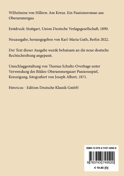 Wilhelmine von Hillern: Am Kreuz. Ein Passionsroman aus OberammergauErstdruck: Stuttgart, Union Deutsche Verlagsgesellschaft, 1890.Neuausgabe, herausgegeben von Karl-Maria Guth, Berlin 2023.Der Text dieser Ausgabe wurde behutsam an die neue deutsche Rechtschreibung angepasst.Umschlagabbildung: Oberammergauer Passionsspiel, Kreuzigung, fotografiert von Joseph Albert, 1871Gesetzt aus der Minion Pro, 11 pt.Die Sammlung Hofenberg erscheint im Verlag Henricus - Edition Deutsche Klassik GmbH, Berlin