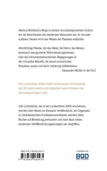 Sternensysteme sind wir im Zeitalter von facebook, myspace und twitter auch zueinander. Das Glänzen in Selbstdarstellung im Netz, das aufmunternde Blinken des Cursors. Wohl nur offline und allein gibt es einen Rest Geheimnis: »Heimlich / war jeder in seinen Wänden. Suspekt.« Markus Breidenich fängt in seinen durchkomponierten Gedichten die Koordinaten des modernen Menschen ein. In wunderschönen Versen wird das Wesen der Planeten erfahrbar.