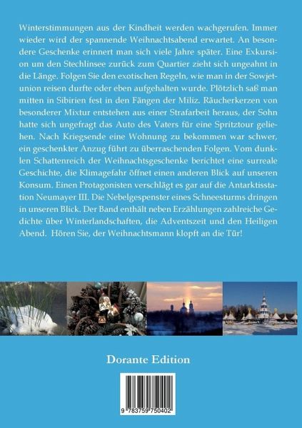 Winterstimmungen aus der Kindheit werden wachgerufen. Immer wieder wird der spannende Weihnachtsabend erwartet. An besondere Geschenke erinnert man sich viele Jahre später. Eine Exkursion um den Stechlinsee zurück zum Quartier zieht sich ungeahnt in die Länge. Folgen Sie den exotischen Regeln, wie man in der Sowjetunion reisen durfte oder eben aufgehalten wurde. Plötzlich saß man mitten in Sibirien fest in den Fängen der Miliz. Räucherkerzen von besonderer Mixtur entstehen aus einer Strafarbeit heraus, der Sohn hatte sich ungefragt das Auto des Vaters für eine Spritztour geliehen. Nach Kriegsende eine Wohnung zu bekommen war schwer, ein geschenkter Anzug führt zu überraschenden Folgen. Vom dunklen Schattenreich der Weihnachtsgeschenke berichtet eine surreale Geschichte, die Klimagefahr öffnet einen anderen Blick auf unseren Konsum. Einen Protagonisten verschlägt es gar auf die Antarktisstation Neumayer III. Die Nebelgespenster eines Schneesturms dringen in unseren Blick. Der Bandenthält neben Erzählungen zahlreiche Gedichte über Winterlandschaften, die Adventszeit und den Heiligen Abend. Hören Sie, der Weihnachtsmann klopft an die Tür!