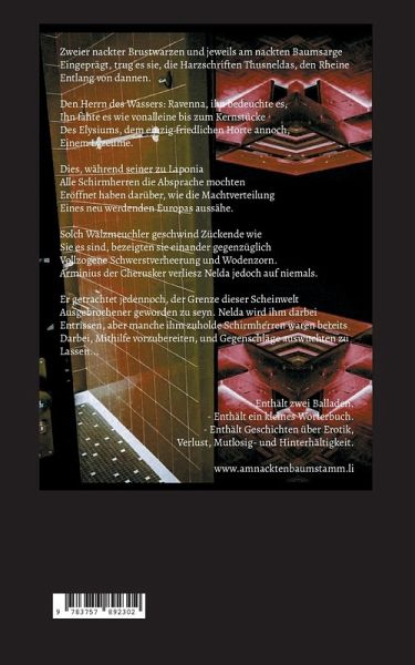 Zweier nackter Brustwarzen und jeweils am nackten Baumsargeeingepräget, trug es sie, die Harzschriften Thusneldas,den Rheine entlang von dannen.Den Herrn des Wassers: Ravenna, ihn bedeuchte es,ihn fähte es wie vonalleine bis zum Kernstückedes Elysiums, dem einzig friedlichen Horte annoch,einem Lyzeume.Dies, während seiner zu Laponiaalle Schirmherren die Absprache mochteneröffnet haben darüber, wie die Machtverteilungeines neu werdenden Europas aussähe.Solch Wälzmeuchler geschwind Zückende wiesie es sind, bezeigten sie einander gegenzüglichvollzogene Schwerstverheerung und Wodenzorn.Arminius der Cherusker verliesz Nelda jedoch auf niemals.Er getrachtet jedennoch, der Grenze dieser ScheinweltAusgebrochener geworden zu seyn. Nelda wird ihm darbeientrissen, aber manche ihm zuholde Schirmherren waren bereits darbei, Mithilfe vorzubereiten, und Gegenschläge auswuchten zu lassen...- Enthält zwei Balladen.- Enthält ein kleines Wörterbuch.- Enthält Geschichten über Erotik,Verlust, Mutlosig- und Hinterhältigkeit.- Obacht: die Silbenschönheitsteht vordergründigwww.amnacktenbaumstamm.li