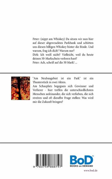 "Am Neubaugebiet ist ein Park" ist ein Theaterstück in zwei Akten.Am Schauplatz begegnen sich Gewinner und Verlierer - hier treffen die unterschiedlichsten Menschen aufeinander, die sich verlieben, die sich streiten und oft dieselbe Frage stellen: Was wird mir die Zukunft bringen?Das Stück wurde 1999 verfasst, bezieht sich auf die Zeit Mitte der 90er Jahre und schlummerte bis 2017 in einer digitalen Schublade.Zukunftsangst, Arbeitslosigkeit, Beziehung und Liebe sind die Themen der vorwiegend jungen Leute in diesem Stück.
