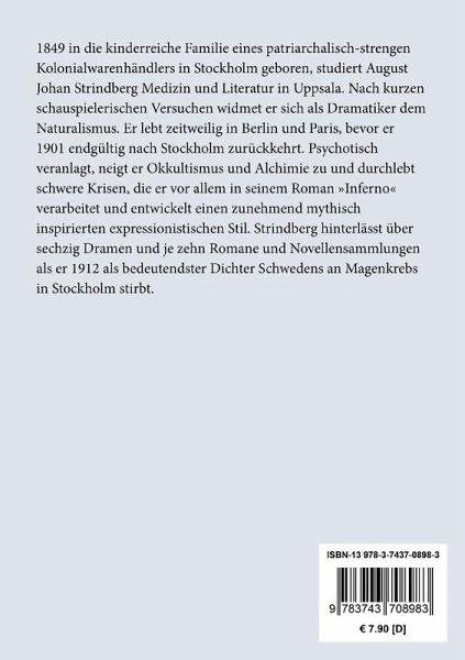1849 in die kinderreiche Familie eines patriarchalisch-strengen Kolonialwarenhändlers in Stockholm geboren, studiert August Johan Strindberg Medizin und Literatur in Uppsala. Nach kurzen schauspielerischen Versuchen widmet er sich als Dramatiker dem Naturalismus. Er lebt zeitweilig in Berlin und Paris, bevor er 1901 endgültig nach Stockholm zurückkehrt. Psychotisch veranlagt, neigt er Okkultismus und Alchimie zu und durchlebt schwere Krisen, die er vor allem in seinem Roman "Inferno" verarbeitet und entwickelt einen zunehmend mythisch inspirierten expressionistischen Stil. Strindberg hinterlässt über sechzig Dramen und je zehn Romane und Novellensammlungen als er 1912 als bedeutendster Dichter Schwedens an Magenkrebs in Stockholm stirbt.