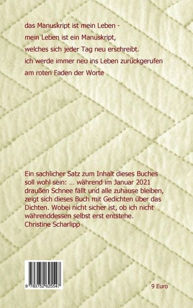 Ein sachlicher Satz zum Inhalt dieses Buches soll wohl sein: ... während im Januar 2021 draußen Schnee fällt und alle zuhause bleiben, zeigt sich dieses Buch mit Gedichten über das Dichten. Wobei nicht sicher ist, ob ich nicht währenddessen selbst erst entstehe. Christine Scharlipp