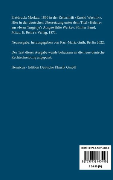 Iwan Turgenjew: Am Vorabend. Roman einer tragischen Liebe zu Zeiten des KrimkriegesErstdruck: Moskau, 1860 in der Zeitschrift »Russki Westnik«. Hier in der deutschen Übersetzung unter dem Titel »Helene« aus »Iwan Turgénje's Ausgewählte Werke«, Fünfter Band, Mitau, E. Behre's Verlag, 1871.Neuausgabe, herausgegeben von Karl-Maria Guth, Berlin 2023.Der Text dieser Ausgabe wurde behutsam an die neue deutsche Rechtschreibung angepasst.Umschlagabbildung: Gustave Courbet, Liebende auf dem Lande, 1844Gesetzt aus der Minion Pro, 11 pt.Die Sammlung Hofenberg erscheint im Verlag Henricus - Edition Deutsche Klassik GmbH, BerlinÜber den Autor:1818 in Orjol, etwa 350 km südwestlich von Moskau, in eine sehr wohlhabende Adelsfamilie hineingeboren, studiert Iwan Sergejewitsch Turgenew Literatur in Moskau und St. Petersburg bevor er ab 1838 ausgedehnte Studienreisen durch Westeuropa unternimmt. Zu dieser Zeit erscheinen seine ersten Gedichte im Druck. 1841 kehrt er zurück nach Russland, übernimmt kurzfristig eine Stellung als Beamter in St. Petersburg und kehrt schließlich auf das Gut seiner Familie zurück. Der lyrische Grundton seiner Novellen verhilft ihm rasch zu einem hohen Bekanntheitsgrad, seine liberale Weltanschauung hingegen führt ihn zwischenzeitlich in die Verbannung. Nachdem er die Leibeigenen seines Gutes freigegeben hat, verlässt er 1855 Russland dauerhaft und lebt in Deutschland, überwiegend in Baden-Baden, und Frankreich als aktives Mitglied des literarischen Jet Sets seiner Zeit. Neben seiner literarischen Begabung ist Turgenew ein brillanter Schachspieler und Turnierausrichter. Mit Iwan Sergejewitsch Turgenew stirbt am 3. September 1883 in der Nähe von Paris einer der bedeutendsten Vertreter des russischen Realismus an einem Krebsleiden.
