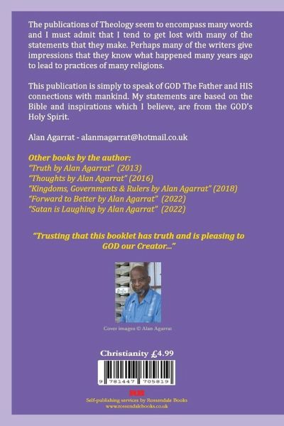 The publications of Theology seem to encompass many words and I must admit that I tend to get lost with many of the statements that they make. Perhaps many of the writers give impressions that they know what happened many years ago to lead to practices of many religions. This publication is simply to speak of GOD The Father and HIS connections with mankind. My statements are based on the Bible and inspirations which I believe, are from the GOD's Holy Spirit. Alan Agarrat - alanmagarrat@hotmail.co.uk Other books by the author: "Truth by Alan Agarrat" (2013) "Thoughts by Alan Agarrat" (2016) "Kingdoms, Governments & Rulers by Alan Agarrat" (2018) "Forward to Better by Alan Agarrat" (2022) "Satan is Laughing by Alan Agarrat" (2022)