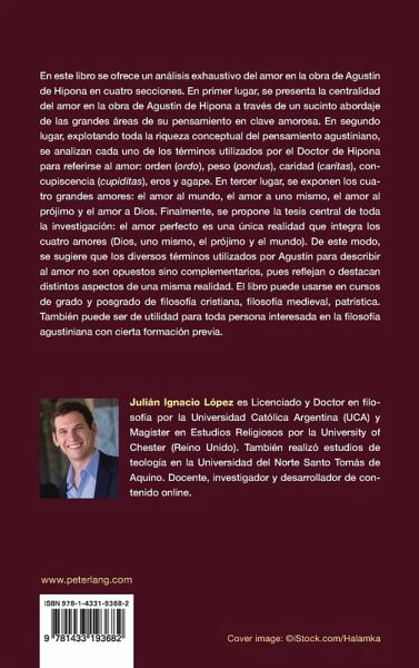 En este libro se ofrece un análisis exhaustivo del amor en la obra de Agustín de Hipona en cuatro secciones. En primer lugar, se presenta la centralidad del amor en la obra de Agustín de Hipona a través de un sucinto abordaje de las grandes áreas de su pensamiento en clave amorosa. En segundo lugar, explotando toda la riqueza conceptual del pensamiento agustiniano, se analizan cada uno de los términos utilizados por el Doctor de Hipona para referirse al amor: orden (ordo), peso (pondus), caridad ( caritas), concupiscencia (cupiditas), eros y agape. En tercer lugar, se exponen los cuatro grandes amores: el amor al mundo, el amor a uno mismo, el amor al prójimo y el amor a Dios. Finalmente, se propone la tesis central de toda la investigación: el amor perfecto es una única realidad que integra los cuatro amores (Dios, uno mismo, el prójimo y el mundo). De este modo, se sugiere que los diversos términos utilizados por Agustín para describir al amor no son opuestos sino complementarios, pues reflejan o destacan distintos aspectos de una misma realidad. El libro puede usarse en cursos de grado y posgrado de filosofía cristiana, filosofía medieval, patrística. También puede ser de utilidad para toda persona interesada en la filosofía agustiniana con cierta formación previa.