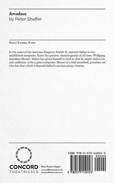 This provocative work weaves a confrontation between mediocrity and genius into a tale of breathtaking dramatic power. In the court of the Austrian Emperor Josef, Antonio Salieri is the established composer. Enter the greatest musical genius of all time: Wolfgang Amadeus Mozart. Salieri has given himself to God so that he might realize his sole ambition to be a great composer. Mozart is a foul-mouthed, graceless oaf who has that which is beyond Salieri's envious grasp: Genius.