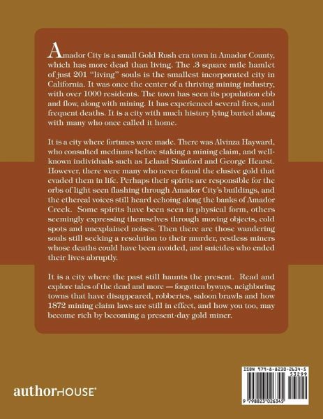 Amador City is a small Gold Rush era town in Amador County, which has more dead than living. The .3 square mile hamlet of just 201 "living" souls is the smallest incorporated city in California. It was once the center of a thriving mining industry, with over 1000 residents. The town has seen its population ebb and flow, along with mining. It has experienced several fires, and frequent deaths. It is a city with much history lying buried along with many who once called it home. It is a city where fortunes were made. There was Alvinza Hayward, who consulted mediums before staking a mining claim, and well-known individuals such as Leland Stanford and George Hearst. However, there were many who never found the elusive gold that evaded them in life. Perhaps their spirits are responsible for the orbs of light seen flashing through Amador City's buildings, and the ethereal voices still heard echoing along the banks of Amador Creek. Some spirits have been seen in physical form, others seemingly expressing themselves through moving objects, cold spots and unexplained noises. Then there are those wandering souls still seeking a resolution to their murder, restless miners whose deaths could have been avoided, and suicides who ended their lives abruptly. It is a city where the past still haunts the present. Read and explore tales of the dead and more - forgotten byways, neighboring towns that have disappeared, robberies, saloon brawls and how 1872 mining claim laws are still in effect, and how you too, may become rich by becoming a present-day gold miner.