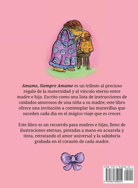 Amame, Siempre Amame es un tributo al precioso regalo de la maternidad y al vínculo eterno entre madre e hija. Escrito como una lista de instrucciones de cuidados amorosos de una niña a su madre; este libro ofrece una invitación a contemplar las maravillas que suceden cada día en el mágico viaje que es crecer. Este libro tiene la capacidad de convertirse en recuerdo para toda la familia, lleno de vibrantes ilustraciones pintadas a mano en acuarela y tinta, retratando el amor universal y la sabiduría grabada en el corazón de cada madre. Estas hermosas ilustraciones pueden ser contempladas una y otra vez por años por venir. Las ilustraciones son de mamás: oso, conejitos, renos, gansos, hámsters y tortuguitas. Little Book Farmers children's picture book, Love Me, Always Love Me is a tribute to the precious gift of motherhood and the eternal bond between a mother and daughter. Written as a list of loving care instructions from a child to her mother, this book offers an invitation to contemplate the wonders that happen every day in the magical journey of growing up. This children's book will become a family keepsake-featuring vibrant hand-painted watercolor illustrations of mother and daughter bears, rabbits, reindeer, geese, guinea pigs, and turtles. These beautiful illustrations can be contemplated over and over again for years to come, portraying the universal love and wisdom engraved in every mother's heart.