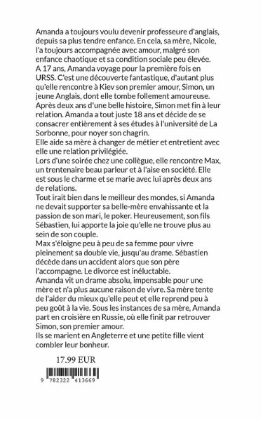 Amanda a toujours voulu devenir professeure d'anglais, depuis sa plus tendre enfance. En cela, sa mère, Nicole, l'a toujours accompagnée avec amour, malgré son enfance chaotique et sa condition sociale peu élevée.A 17 ans, Amanda voyage pour la première fois en URSS. C'est une découverte fantastique, d'autant plus qu'elle rencontre à Kiev son premier amour, Simon, un jeune Anglais, dont elle tombe follement amoureuse. Après deux ans d'une belle histoire, Simon met fin à leur relation. Amanda a tout juste 18 ans et décide de se consacrer entièrement à ses études à l'université de La Sorbonne, pour noyer son chagrin.Elle aide sa mère à changer de métier et entretient avec elle une relation privilégiée.Lors d'une soirée chez une collègue, elle rencontre Max, un trentenaire beau parleur et à l'aise en société. Elle est sous le charme et se marie avec lui après deux ans de relations. Tout irait bien dans le meilleur des mondes, si Amanda ne devait supporter sa belle-mère envahissante et la passion de son mari, le poker. Heureusement, son fils Sébastien, lui apporte la joie qu'elle ne trouve plus au sein de son couple.Max s'éloigne peu à peu de sa femme pour vivre pleinement sa double vie, jusqu'au drame. Sébastien décède dans un accident alors que son père l'accompagne. Le divorce est inéluctable.Amanda vit un drame absolu, impensable pour une mère et n'a plus aucune raison de vivre. Sa mère tente de l'aider du mieux qu'elle peut et elle reprend peu à peu goût à la vie. Sous les instances de sa mère, Amanda part en croisière en Russie, où elle finit par retrouver Simon, son premier amour. Ils se marient en Angleterre et une petite fille vient combler leur bonheur.