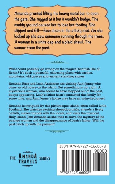 What could possibly go wrong on the magical Scottish Isle of Arran? It's such a peaceful, charming place with castles, mountains, old graves and ancient standing stones. Amanda Ross and Leah Anderson are visiting Aunt Jenny who owns an old house on the island. But something is not right. A mysterious woman, who seems to have stepped out of the past, keeps appearing, Leah's father hasn't contacted the family for some time, and Aunt Jenny's house may have an uninvited guest. Amanda is intrigued by this picturesque island, often called Little Scotland. She watches exciting sheepdog trials, attends a lively ceilidh, makes friends with the locals, and visits the mystical Holy Island. Join Amanda as she tries to solve the mystery of the strange woman and the disappearance of Leah's father. Will the past catch up with the present?