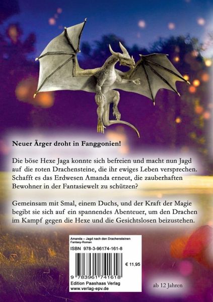 Neuer Ärger droht in Fanggonien! Die böse Hexe Jaga konnte sich befreien und macht nun Jagd auf die roten Drachensteine, die ihr ewiges Leben versprechen. Schafft es das Erdwesen Amanda erneut, die zauberhaften Bewohner in der Fantasiewelt zu schützen? Gemeinsam mit Smal, dem Duchs, und der Kraft der Magie begibt sie sich auf ein spannendes Abenteuer, um den Drachen im Kampf gegen die Hexe und die Gesichtslosen beizustehen. ab 12 Jahren Dieser Nachfolge-Roman der Fantasy-Story Amanda - eine unglaubliche Reise sorgt für neue Spannung und noch mehr Magie. Das Buch kann auch gelesen werden, wenn man den 1. Teil nicht kennt.