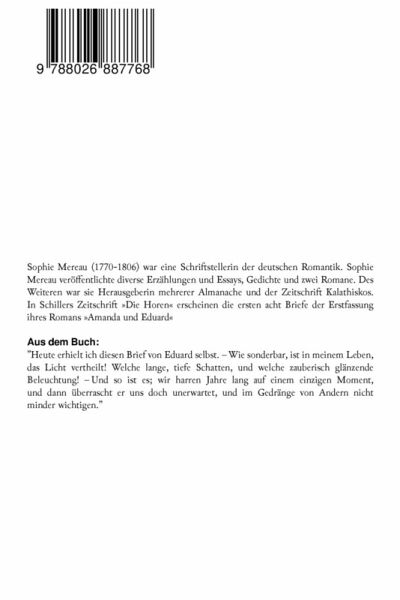Sophie Mereau (1770-1806) war eine Schriftstellerin der deutschen Romantik. Sophie Mereau veröffentlichte diverse Erzählungen und Essays, Gedichte und zwei Romane. Des Weiteren war sie Herausgeberin mehrerer Almanache und der Zeitschrift Kalathiskos. In Schillers Zeitschrift Die Horen erscheinen die ersten acht Briefe der Erstfassung ihres Romans Amanda und Eduard Aus dem Buch: "Heute erhielt ich diesen Brief von Eduard selbst. - Wie sonderbar, ist in meinem Leben, das Licht vertheilt! Welche lange, tiefe Schatten, und welche zauberisch glänzende Beleuchtung! - Und so ist es; wir harren Jahre lang auf einem einzigen Moment, und dann überrascht er uns doch unerwartet, und im Gedränge von Andern nicht minder wichtigen."
