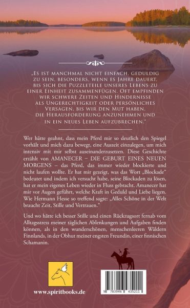 Wer hätte geahnt, dass mein Pferd mir so deutlich den Spiegel vorhält und mich dazu bewegt, eine Auszeit einzulegen, um mich intensiv mit mir selbst auseinanderzusetzen. Diese Geschichte erzählt von AMANECER - DIE GEBURT EINES NEUEN MORGENS - das Pferd, das immer wieder blockierte und nicht laufen wollte. Er hat mir gezeigt, was das Wort "Blockade" bedeutet und indem ich versucht habe, seine Blockaden zu lösen, hat er mein eigenes Leben wieder in Fluss gebracht. Amanecer hat mir vor Augen geführt, welche Kraft in Geduld und Liebe liegen. Wie Hermann Hesse so treffend sagte: "Alles Schöne in der Welt braucht Zeit, Stille und Vertrauen." Und wo hätte ich besser Stille und einen Rückzugsort fernab vom Alltagsstress meiner täglichen Ablenkungen und Aufgaben finden können, als in den wunderschönen, menschenleeren Wäldern Finnlands, in der Obhut meiner engsten Freundin, einer finnischen Schamanin.