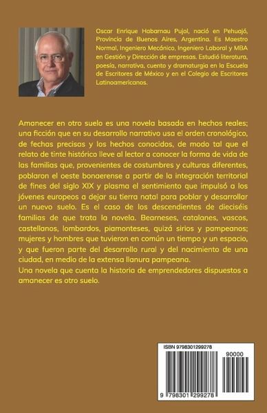 Amanecer en otro suelo es una novela basada en hechos reales; una ficción que en su desarrollo narrativo usa el orden cronológico, de fechas precisas y los hechos conocidos, de modo tal que el relato de tinte histórico lleve al lector a conocer la forma de vida de las familias que, provenientes de costumbres y culturas diferentes, poblaron el oeste bonaerense argentino a partir de la integración territorial de fines del siglo XIX y plasma el sentimiento que impulsó a los jóvenes europeos a dejar su tierra natal para poblar y desarrollar un nuevo suelo. Es el caso de los descendientes de dieciséis familias de que trata la novela. Bearneses, catalanes, vascos, castellanos, lombardos, piamonteses, quizá sirios y pampeanos; mujeres y hombres que tuvieron en común un tiempo y un espacio, y que fueron parte del desarrollo rural y del nacimiento de una ciudad, en medio de la extensa llanura pampeana. Una novela que cuenta la historia de emprendedores dispuestos a amanecer es otro suelo. Oscar Enrique Habarnau Pujol nació en Pehuajó, Provincia de Buenos Aires, Argentina. Es Maestro Normal, Ingeniero Mecánico, Ingeniero Laboral y MBA en Gestión y Dirección de empresas. Estudió literatura, poesía, narrativa, cuento y dramaturgia en la Escuela de Escritores de México y en el Colegio de Escritores Latinoamericanos. Tiene publicados los libros: De corazón, Manzanilla en flor, Residencia temporal, historia de un migrante, Café de la tarde y otros cuentos, Huellas, Amanecer en otro suelo, Héctor Bernardo, Perspectivas (teatro) y Dirección de proyectos industriales (gestión). Es coautor de los libros: Nueve plumas, cuatro tinteros y Cien relatos durante la cuarentena