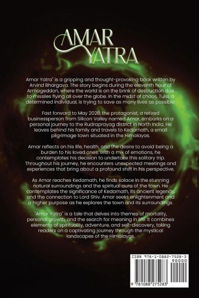"Amar Yatra" is a gripping and thought-provoking book written by Arvind Bhargava. The story begins during the eleventh hour of Armageddon, where the world is on the brink of destruction due to missiles flying all over the globe. In the midst of chaos, Tulsi, a determined individual, is trying to save as many lives as possible. Fast forward to May 2028, the protagonist, a retired businessperson from Silicon Valley named Amar, embarks on a personal journey to the Rudraprayag district in North India. He leaves behind his family and travels to Kedarnath, a small pilgrimage town situated in the Himalayas. Amar reflects on his life, health, and the desire to avoid being a burden to his loved ones. With a mix of emotions, he contemplates his decision to undertake this solitary trip. Throughout his journey, he encounters unexpected meetings and experiences that bring about a profound shift in his perspective. As Amar reaches Kedarnath, he finds solace in the stunning natural surroundings and the spiritual aura of the town. He contemplates the significance of Kedarnath, its ancient legends, and the connection to Lord Shiv. Amar seeks enlightenment and a higher purpose as he explores the town and its surroundings. "Amar Yatra" is a tale that delves into themes of mortality, personal growth, and the search for meaning in life. It combines elements of spirituality, adventure, and self-discovery, taking readers on a captivating journey through the mystical landscapes of the Himalayas.