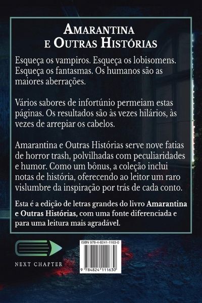 Esqueça os vampiros. Esqueça os lobisomens. Esqueça os fantasmas. Os humanos são as maiores aberrações. Vários sabores de infortúnio permeiam estas páginas. Os resultados são às vezes hilários, às vezes de arrepiar os cabelos. Amarantina e Outras Histórias serve nove fatias de horror trash, polvilhadas com peculiaridades e humor. Como um bônus, a coleção inclui notas de história, oferecendo ao leitor um raro vislumbre da inspiração por trás de cada conto. Edição impressa grande