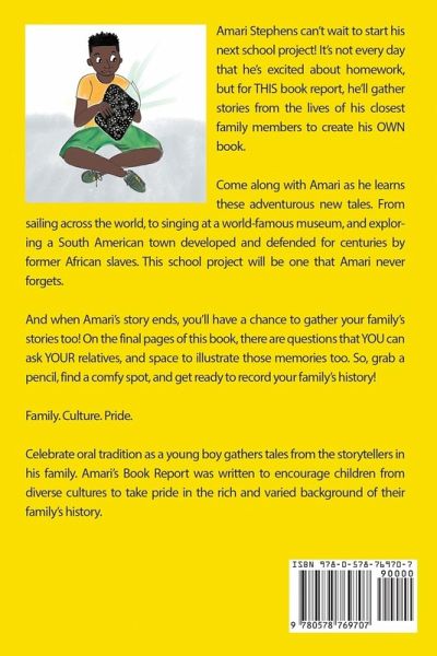 Amari Stephens can't wait to start his next school project! It's not every day that he's excited about homework, but for THIS book report, he'll gather stories from the lives of his closest family members to create his OWN book. Come along with Amari as he learns these adventurous new tales. From sailing across the world, to singing at a world-famous museum, and exploring a South American town developed and defended for centuries by former African slaves. This school project will be one that Amari never forgets. And when Amari's story ends, you'll have a chance to gather your family's stories too! On the final pages of this book, there are questions that YOU can ask YOUR relatives, and space to illustrate those memories too. So, grab a pencil, find a comfy spot, and get ready to record your family's history! Family. Culture. Pride. Celebrate oral tradition as a young boy gathers tales from the storytellers in his family. Amari's Book Report was written to encourage children from diverse cultures to take pride in the rich and varied background of their family's history.